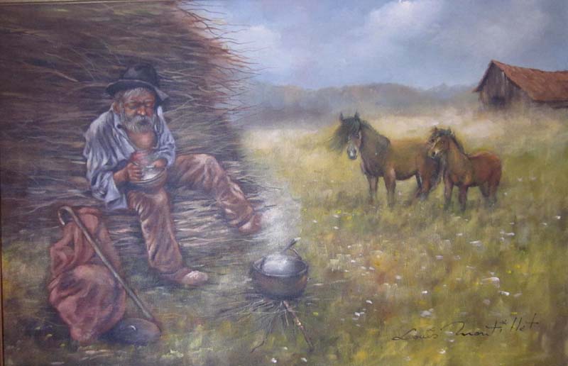The peasant sitting on wood branches, takes the time to enjoy a pause for his bowl of soup. We see the pot heating on the fire. The two horses watching. What a charming country scene!
